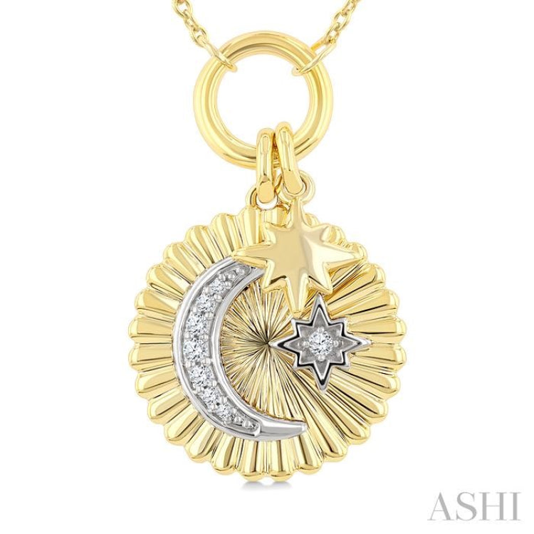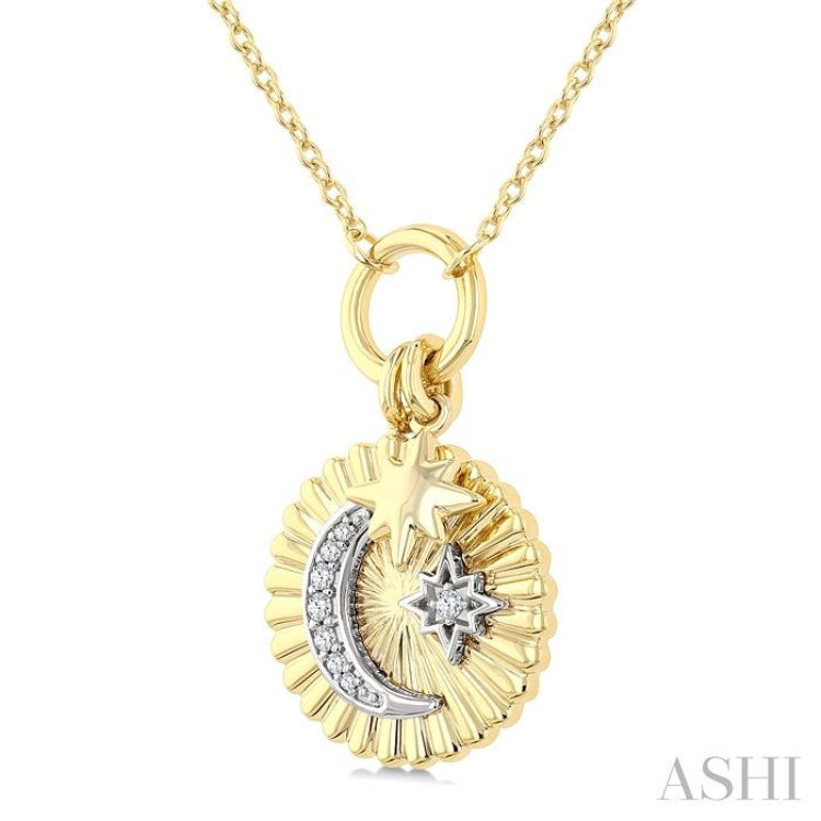 1/20 Ctw Fluted Medallion Crescent Moon & Star Charm Round Cut Diamond Fashion Pendant With Chain in 10K Yellow and White Gold