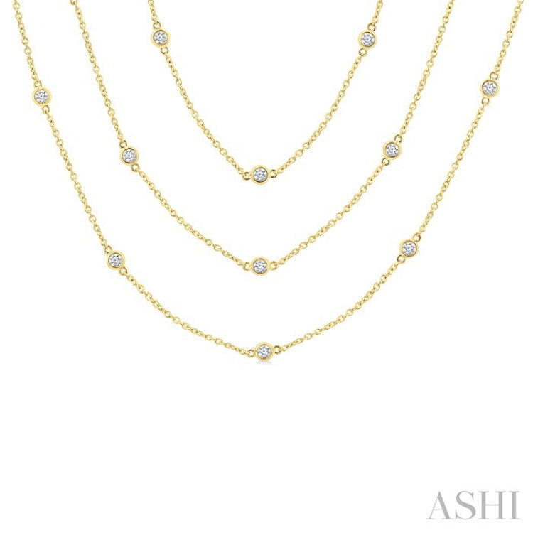 Indulge in luxury with this glamorous diamond long station necklace, which is a grand addition to your jewelry collection. Versatile and stylish, the necklace can be worn in multiple ways. Whether worn as a single long chain for a sleek and sophisticated look or twisted into layers for added volume and dimension, it effortlessly elevates any ensemble. The necklace features a stunning layout of 50 bezel set round cut diamonds adorning the stations of the 60-inch long cable chain, creating an eye-catching effect. A polished finish 14 karat yellow gold body adds a touch of refinement and elegance. Total diamond weight is 2 Ctw.